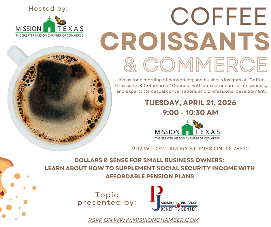 Join us for a morning of networking and business insights at Coffee, Croissants & Commerce, where you’ll connect with entrepreneurs, professionals, and industry experts for casual conversations and meaningful professional development—while also learning how to supplement Social Security income with affordable pension plans.