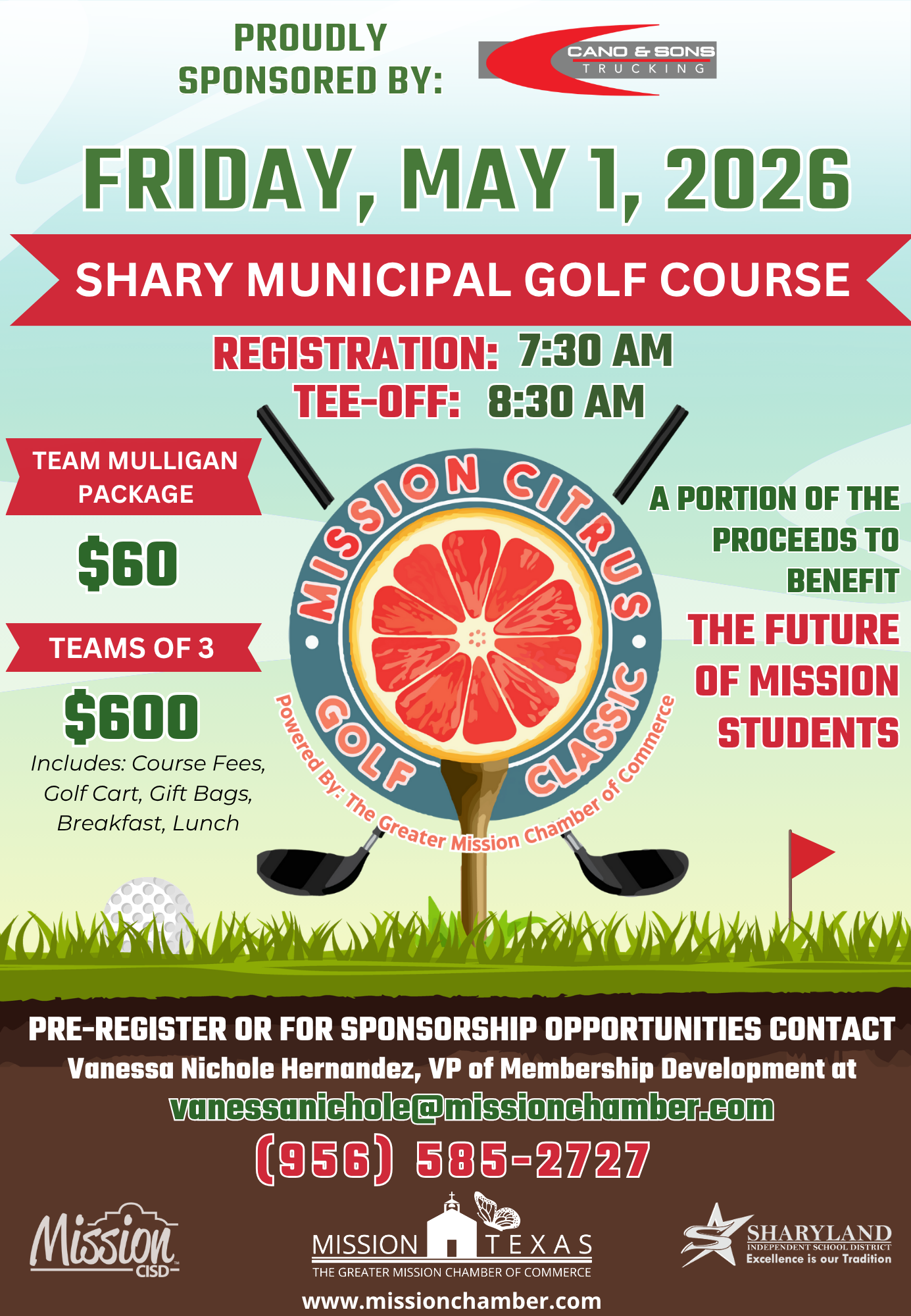 Register your team of 3 for $600, that includes course fees, golf cart, gift bags, breakfast, and lunch. Contact Vanessa Nichole Hernandez, vanessanichole@missionchamber.com or (956) 585-2727 to join us on the green!